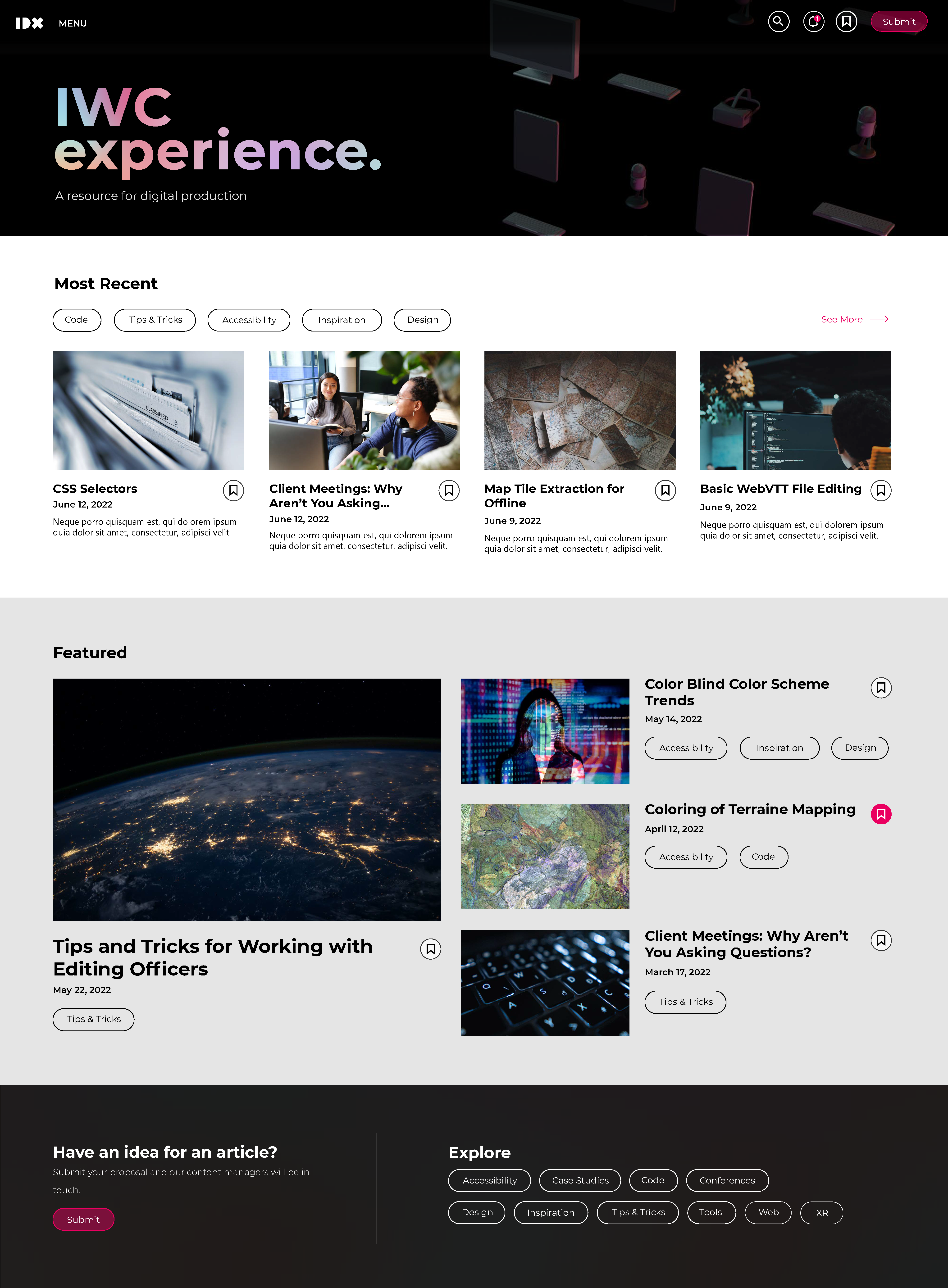 The customer needed a platform to share design inspiration, case studies and tips and tricks about design and development. The design needed to accommodate a small amount of content at launch as well as plan for content population for years to come. The customer required profile-based functionality to store information on user bookmarks, categories followed and notifications on new posts based on categories followed. IWC is a tech-heavy office and wanted the site to look smart and cutting-edge.